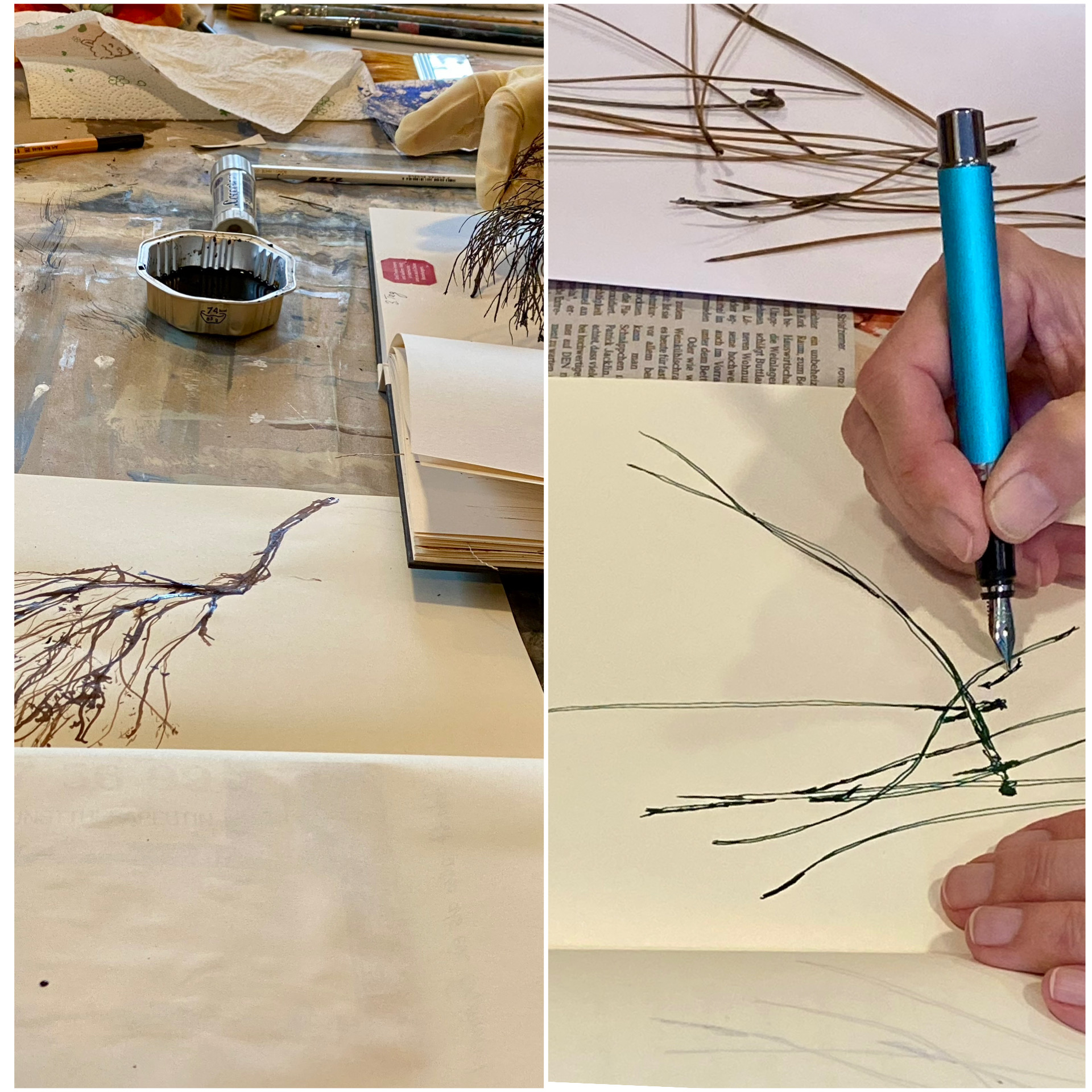 Ein besonderes Lieblingsthema waren Kiefernnadeln. Mit ihnen untersuchten wir Linien und Strukturen, zeichneten, legten, nähten sie sogar in unsere Bilder ein. So entstanden Arbeiten, die weit über das klassische Malen hinausgingen.