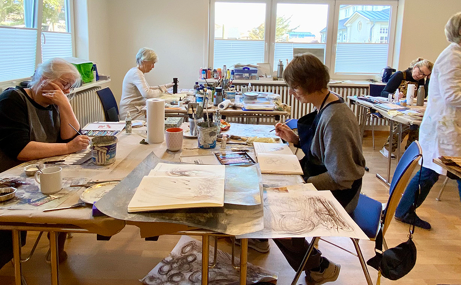 Der Tag begann oft mit kleinen Warm-ups: Zeichnungen mit dem Bleistift, die uns ins Arbeiten brachten. Manchmal wurden daraus längere Studien, die sich bis in den Nachmittag hinein entwickelten. Auch Fundstücke vom Strand fanden ihren Weg aufs Papier – Linien, Formen, Erinnerungen.